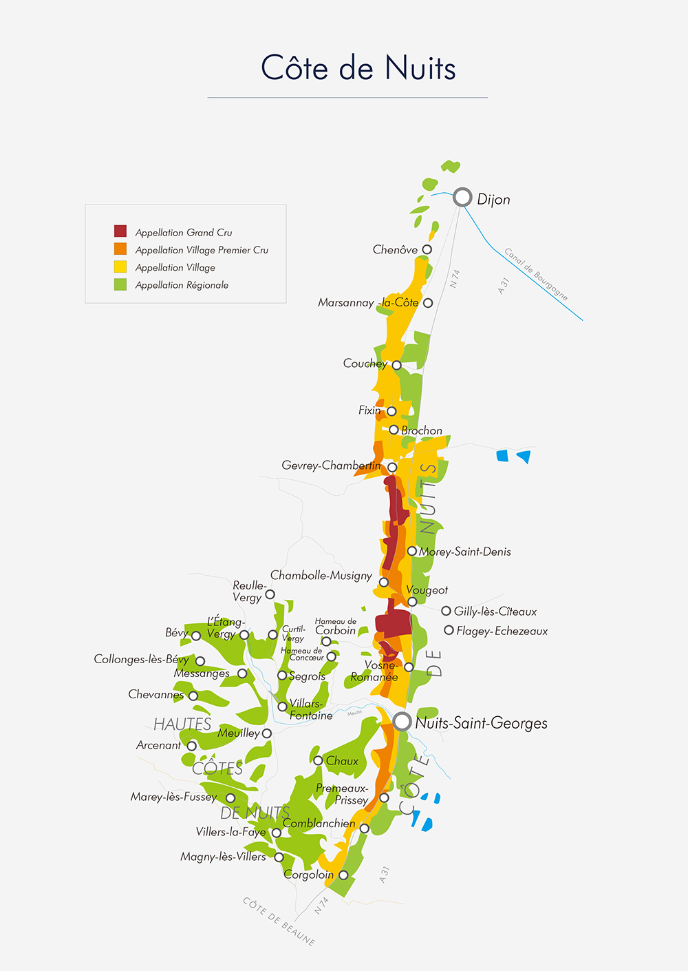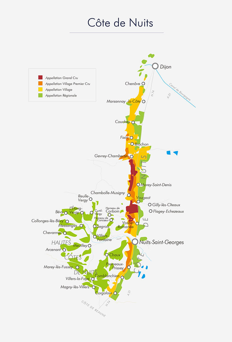 夜丘的精华集中在中段,最南端和最北端的那些较不出名的村庄合称为夜丘村庄(Côte de Nuits-Villages)