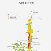 —夜-圣乔治(Nuits-Saint-Georges):虽然此村庄中没有特级葡萄园,但其中很多一级葡萄园,例如布多特斯(Boudots)、一文不值(Les Vaucrains)和圣乔治(Saint-Georges)等名园,并不逊于那些特级葡萄园。村庄北部产区出产的红葡萄酒口感偏温和细腻,而南部偏强劲紧涩。同时也出产少量的霞多丽白葡萄酒。